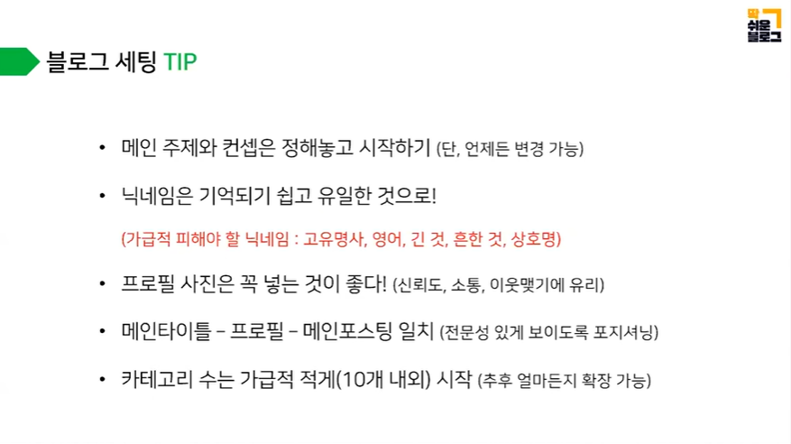 블로그 카테고리를 나누는 방법도 좋았고 블로그 세팅하는 팁, 글감 무한정 뽑아내는 방법, 글쓰기 올릴 때 유사문서에 걸리지 않는 방법 등 실질적으로 도움이 되는 내용들에 감동을 할 정도였습니다.